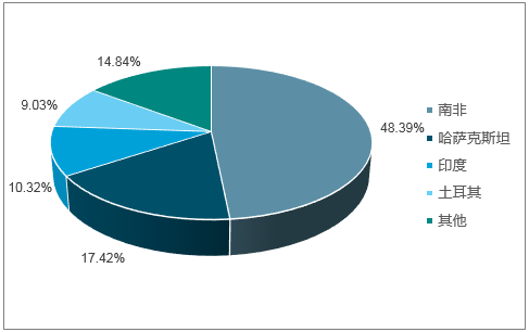 鉻為鋼灰色金屬,鉻礦常被加工成鉻鐵,90%以上用于不銹鋼的生產。世界鉻鐵礦資源總量超過120億噸,據美國地質調查局的數據顯示,鉻鐵礦資源在全球分布極不均衡,主要分布在南非、哈薩克斯坦、津巴布韋、芬蘭、印度、巴西等國,其中,南非、哈薩克斯坦和津巴布韋是世界上鉻鐵礦資源最豐富的3個國家。我國鉻礦資源很大程度以來進口,南非、土耳其和津巴布韋是我國鉻礦的主要進口國,分別占2017年我國鉻礦進口數量的72.34%,8.04%和3.23%。