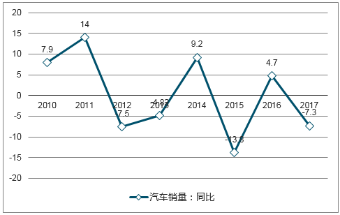 2008年-2017年汽車銷量(萬輛)及其同比變化(%)